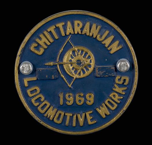 Cast iron round locomotive builders plate, manufactured by Chittaranjan Locomotive Works, Chittaranjan, West Bengal, India in 1969.