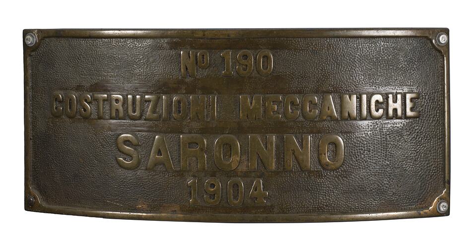 Curved brass rectangular locomotive builders plate, No. 190, manufactured by Construzioni Meccaniche di Saronno, Saronno, Italy in 1904.