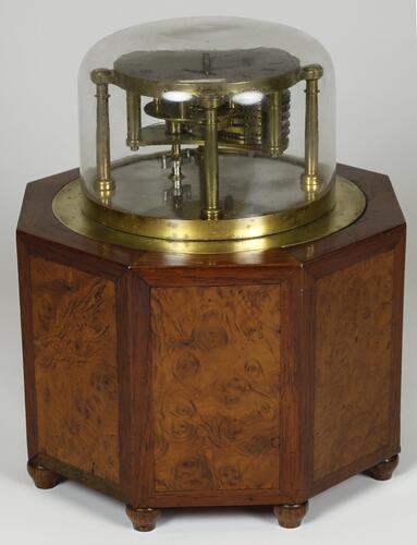 Brass clock under evacuated glass dome, supported by octagonal box with door. Has taps inside box. Spring wound; detent escapement.