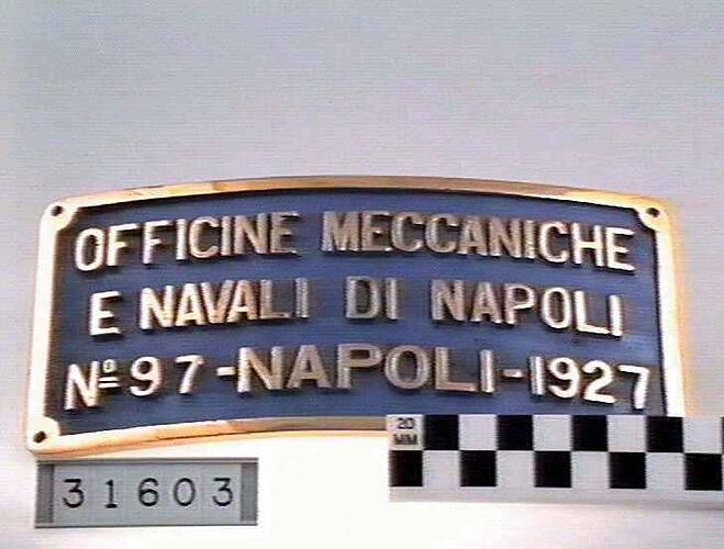 Brass curved rectangular locomotive builders plate, No. 97, manufactured by Officine Meccaniche E Navali Di Napoli, Naples, Italy, 1927.