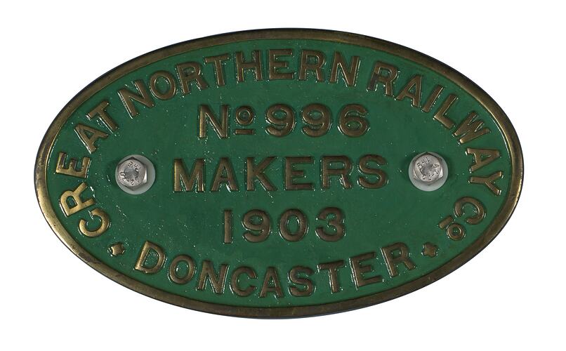 Brass oval locomotive builders plate, No. 996, manufactured by Great Northern Railway, Doncaster Works, England in 1903.