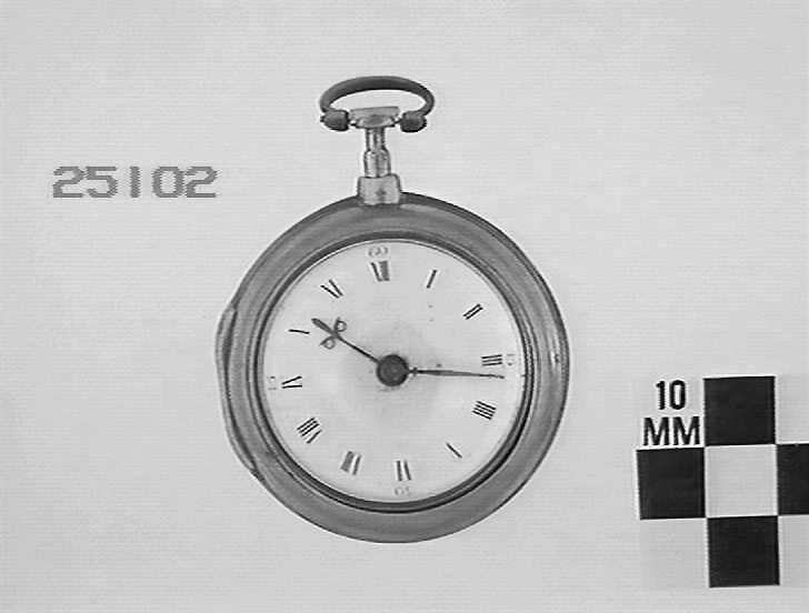 Silver pair case. White enamel dial has roman numerals for hours and arabic numerals for minutes. Key wound spring; verge escapement. Fusee and chain.