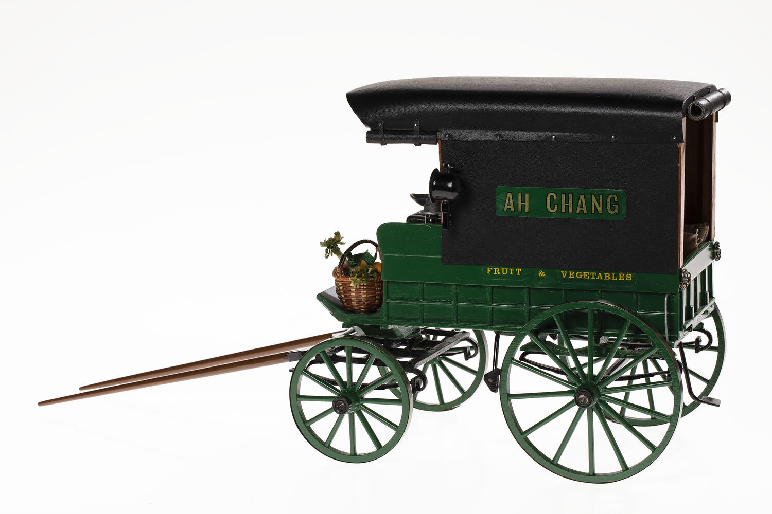 1:10 scale model of a fruiterer's van with four wheels and a driver's seat at the front. It features a black leather roof and seat, black metal chassis, brake mechanism and head lamps, green wooden panels and spokes. There is immitation fruit and vegetables, cloth wheat sacks and a set of metal scales inside the van. The steering and break mechanisms are operable, the wheels rotate and the back panel unlocks and swings down.