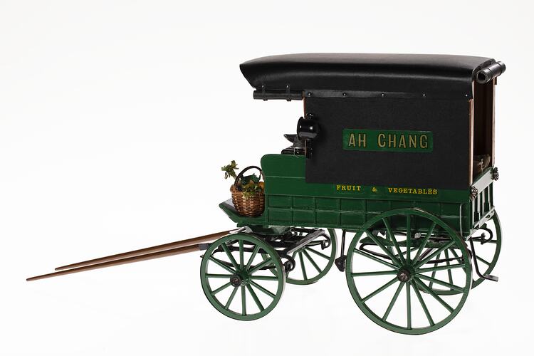 Horse-drawn fruiterer's van of the type used in Melbourne in the 1920s. Model made by Ron Titchener in 1983.