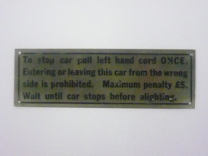 Text: 'To stop car pull left hand cord ONCE. / Entering or leaving this car from the wrong / side is prohibited. Maximum penalty ($)5. / Wait until car stops before alighting.'