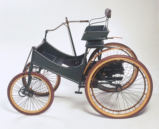 This four-wheeled motor buggy was made by Max Hertel of Chicago, U.S.A., to the order of Canadian-born Melbourne businessman John Pender. Pender later wrote that he had ordered the buggy during a visit to North America in 1896. The vehicle arrived in Melbourne by steamer on 8 November 1897 and is believed to be the first motor vehicle imported into Australia. Mr Pender took the machine for its first trial run from Brunswick to the Coburg tram terminus on Saturday, 13 November 1897. In December 1897 it broke down and caught fire briefly near the Carlton Football Ground in Royal Parade suffering serious damage. The vehicle is powered by a twin-cylinder 3.5 horsepower (2.6 kw) internal-combustion engine. In February 1898, Mr Pender and his Hertel were still such a novelty that the Melbourne Herald reported to readers that: