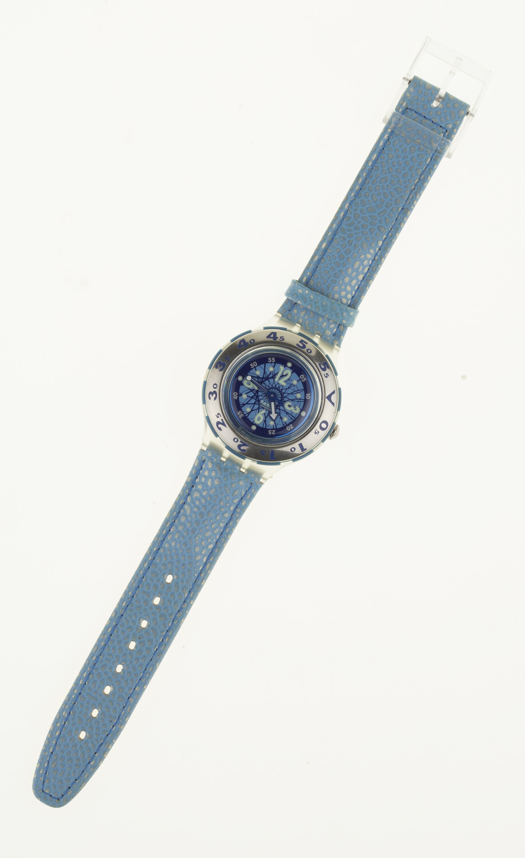 Silver circular face with blue pattern. Numbers on rotating steel ring border. Clear acrylic case. Blue textured leather strap, blue buckle. In box with warranty & instructions. Quartz movement.