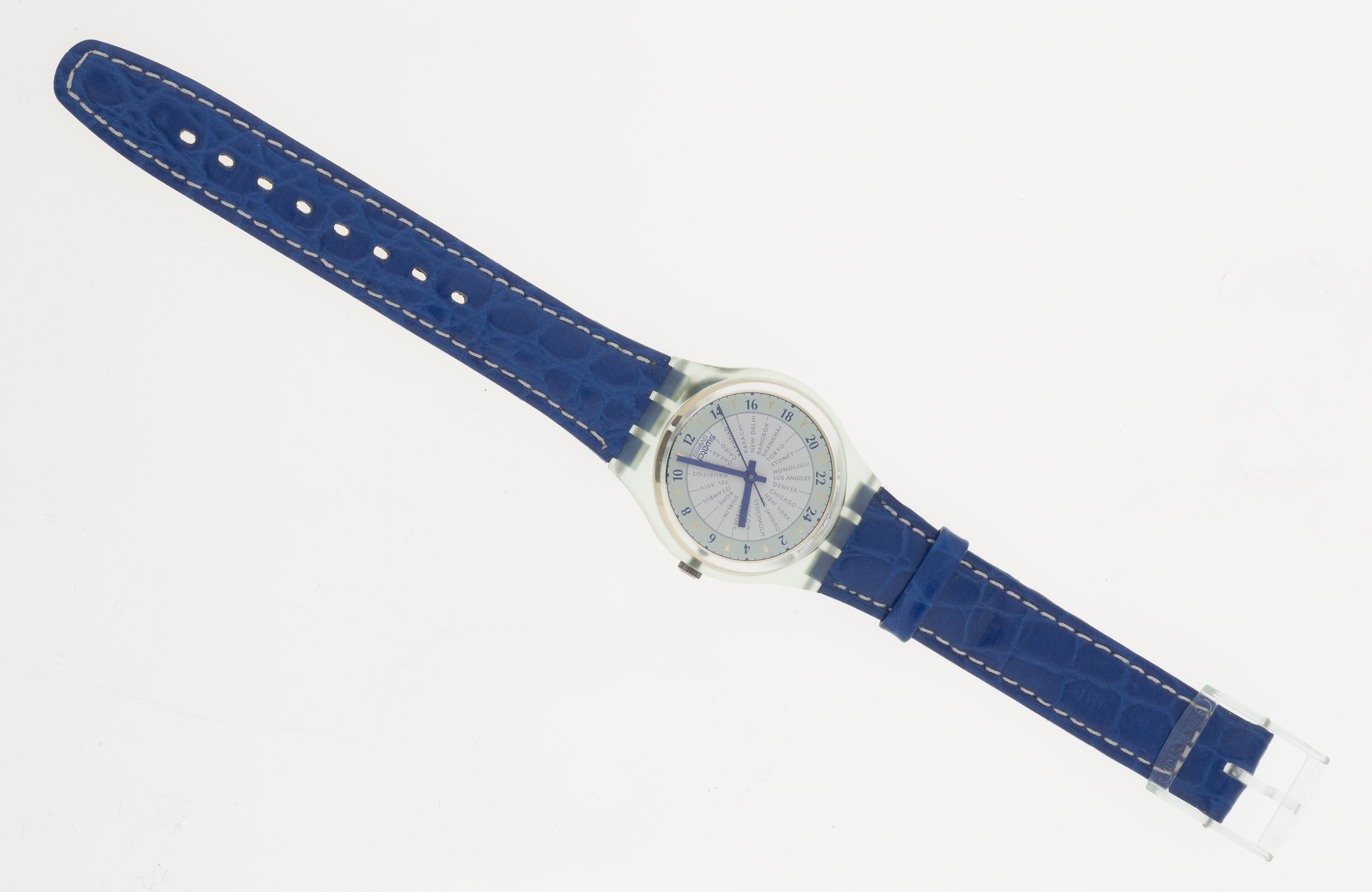 Gents quartz wrist watch, 'Index', GG 125, Swatch SA, Switzerland, 1994. Pale green acrylic case with blue leather strap. Twenty four hour dial with city names.