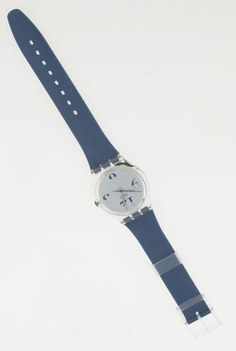 Gents quartz wrist watch, 'Magnitudo', GK 170, Swatch SA, Switzerland, 1994. Clear acrylic case with blue plastic strap.