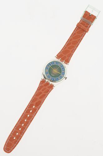 Gents quartz wrist watch, 'Cougar', GK 172, Swatch SA, Switzerland, 1994. Clear acrylic case with orange leather strap.