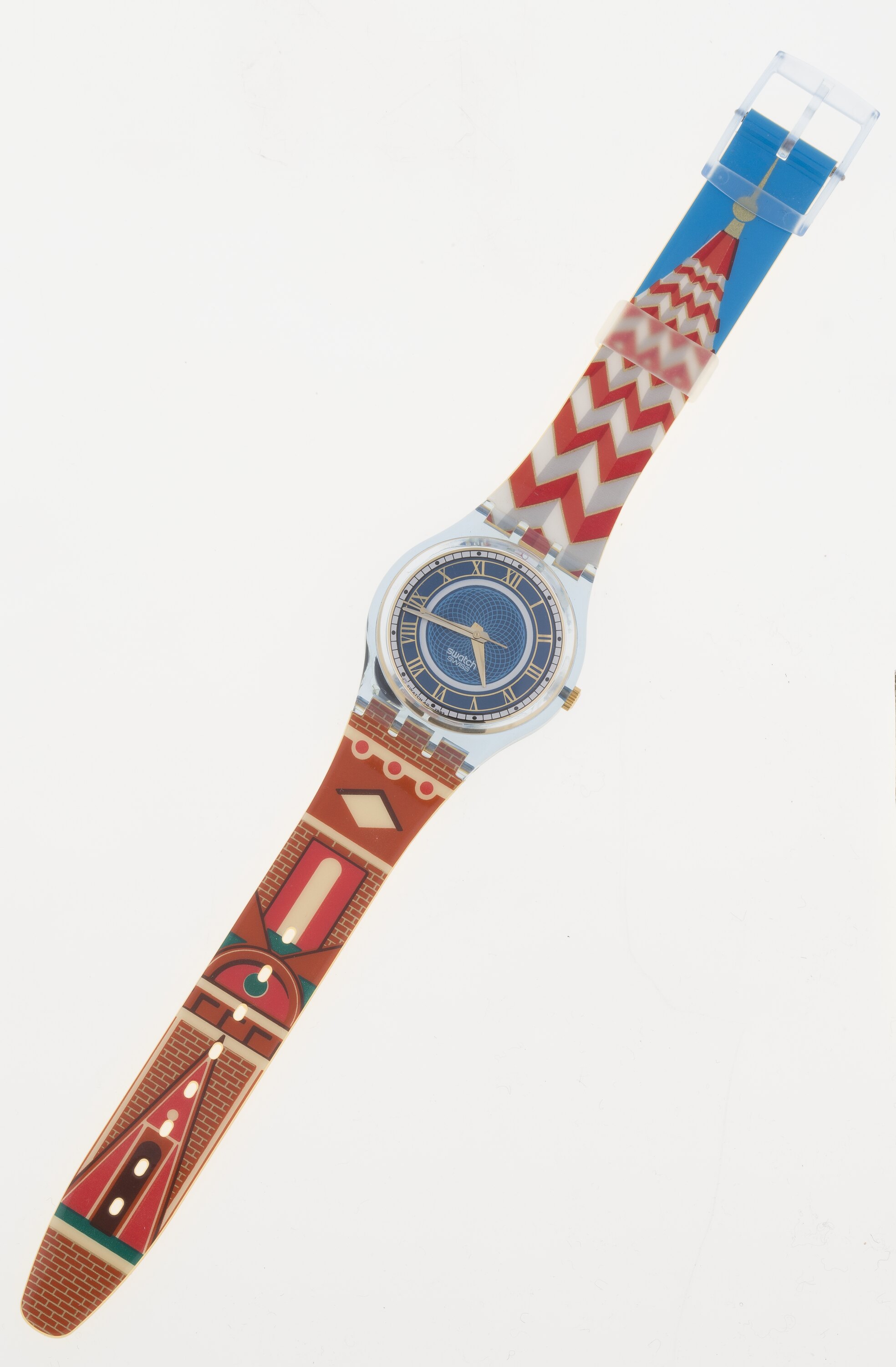 Gents quartz wrist watch, 'Cathedral', GN 135, Swatch SA, Switzerland, 1994. Transparent blue acrylic case, mainly blue face, multicoloured, mainly red, plastic strap.