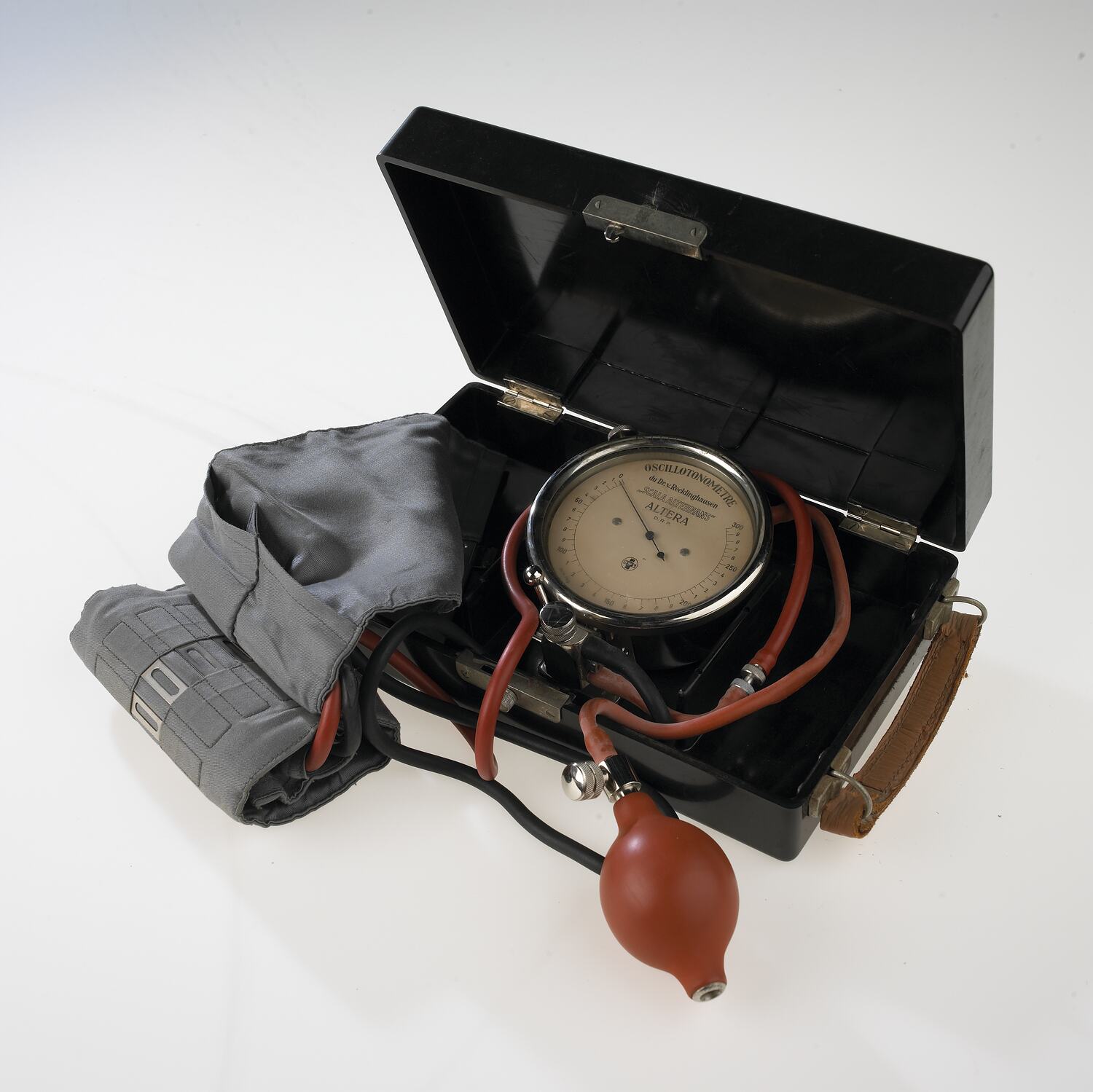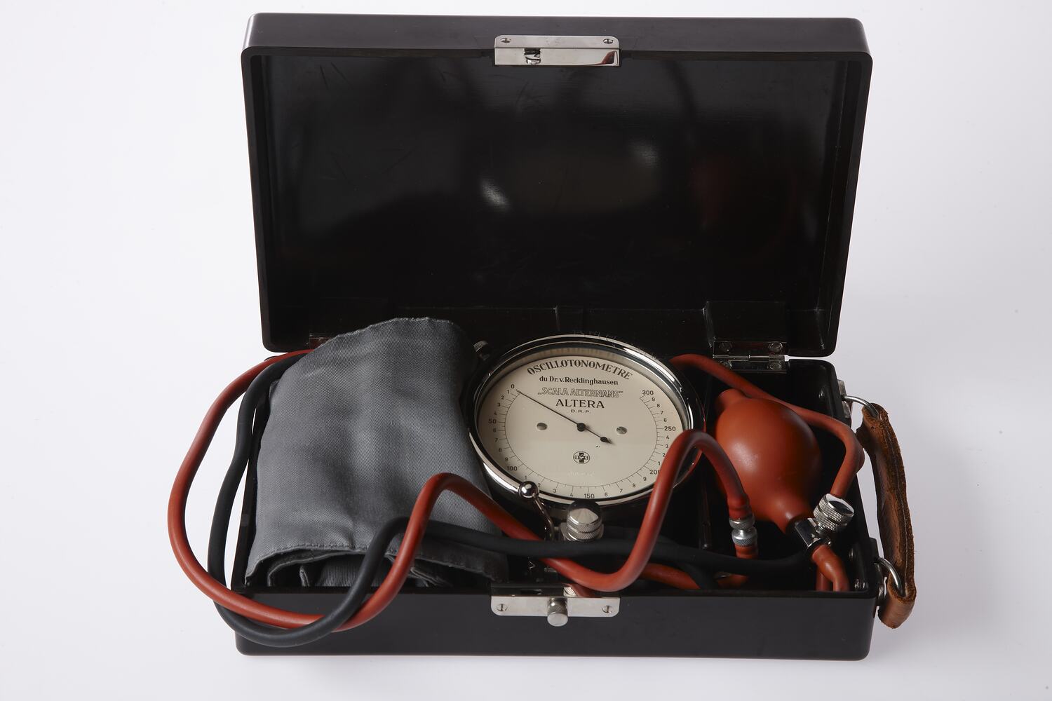 'Dr H. von Recklinghauser' sphygmomanometer for measuring blood pressure. Bakelite case with leather handle. Blood pressure readings are taken from a dial mounted within box. From the Melbourne surgery of Sir Edward (Weary) Dunlop.