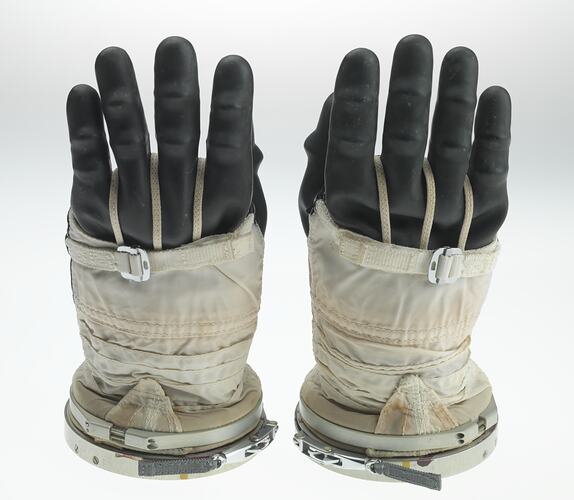 Nylon, leather palm pads, moulded rubber fingers. Aluminium wrist coupling to attach to rest of spacesuit. Cosmonauts initials (VGT) in Cyrillic on wrist.