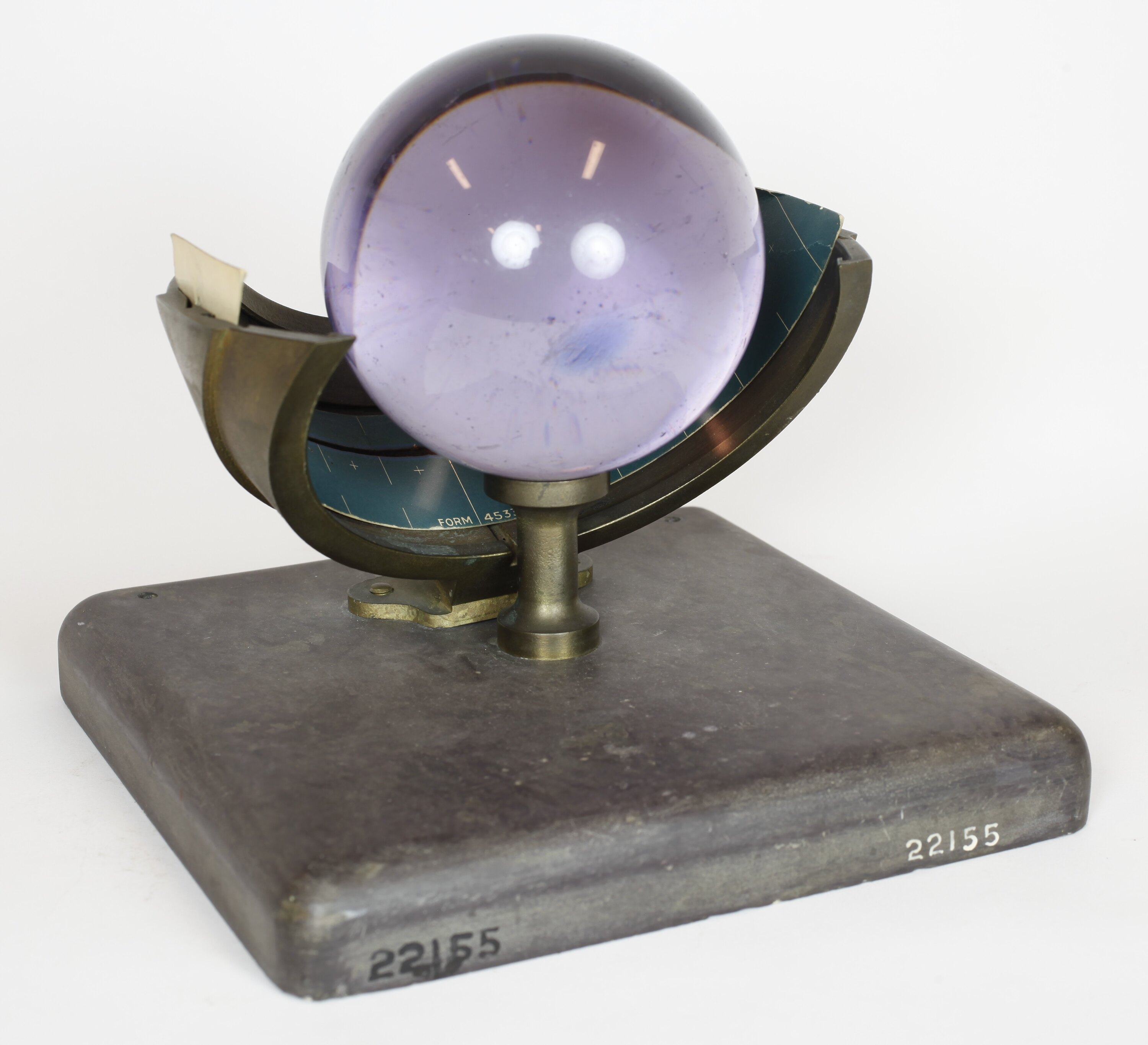 Consists of a glass sphere mounted in metal bowl which is fixed upon a slate base & grooved on its inner surface to hold bent strips of card, with hours marked. Focused heat from the sun burns through the card, and the duration of sunshine is read off from the length of the burnt track.