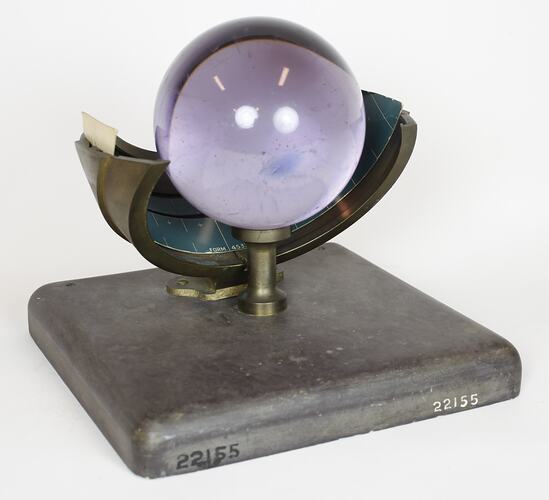 This sunshine recorder was acquired by Melbourne Observatory from Kew Observatory in England in 1880, to begin the daily measurement of hours of sunshine. This type of instrument was originally devised in 1853 by J.F. Campbell and refined by George Stokes in 1880.