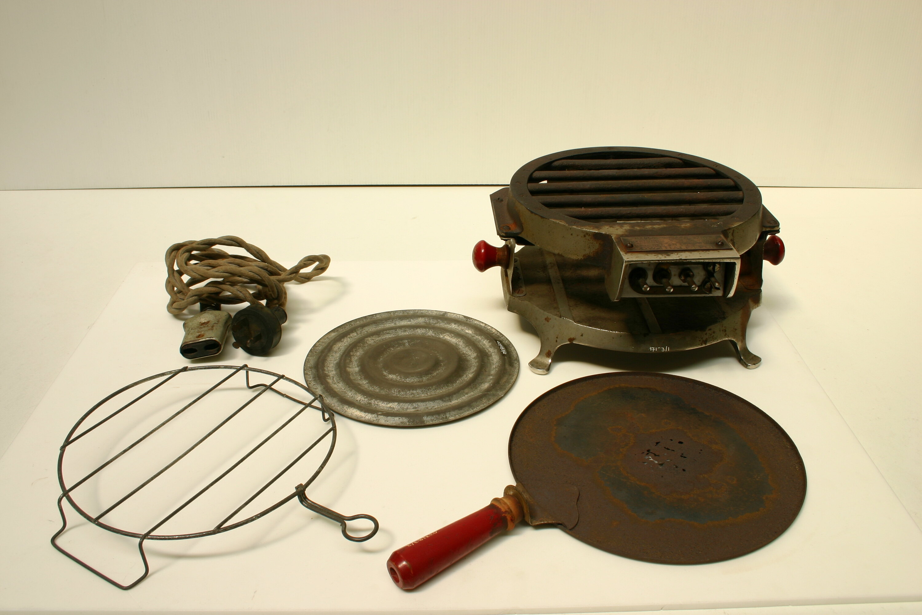 Portable electric Hecla griller with an exposed grill. It was made by Hecla Electrics Pty Ltd in Melbourne in the 1920s.