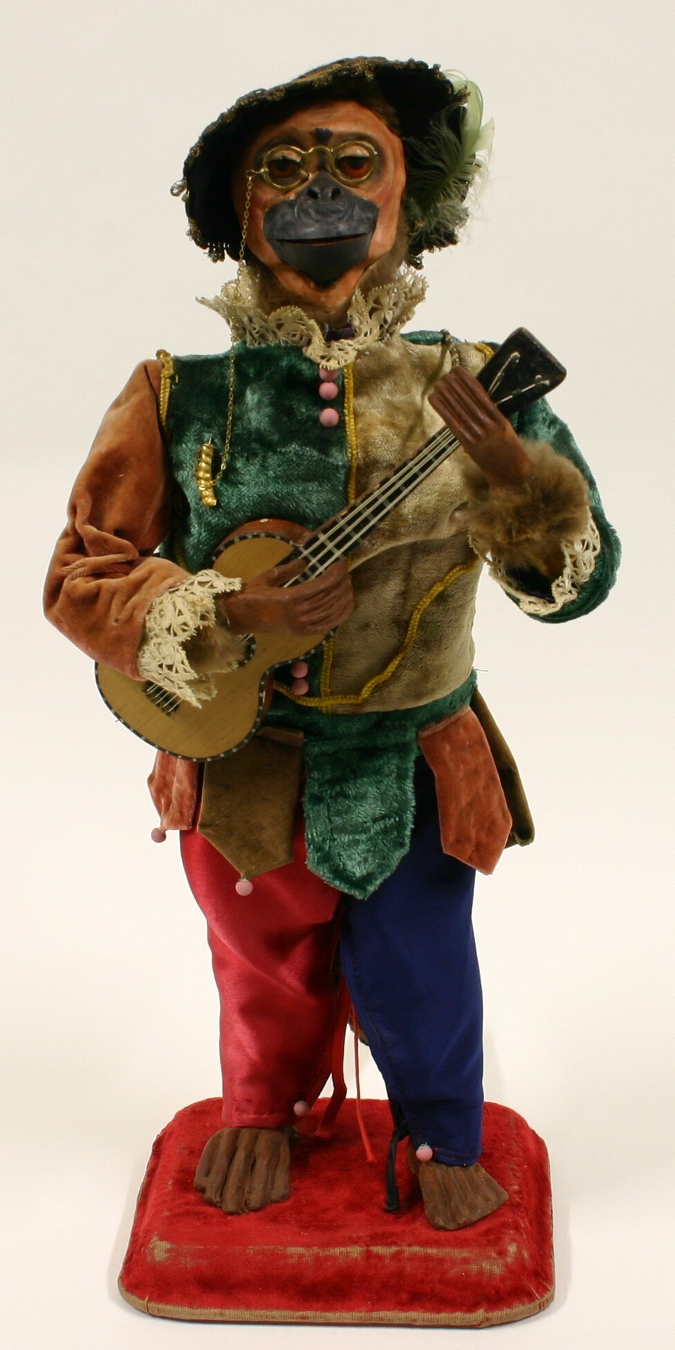 Chimpanzee wearing clothes and hat on a square red velvet base holding a guitar. It's head moves up and down, it's mouth opens and closes and it strums the guitar.