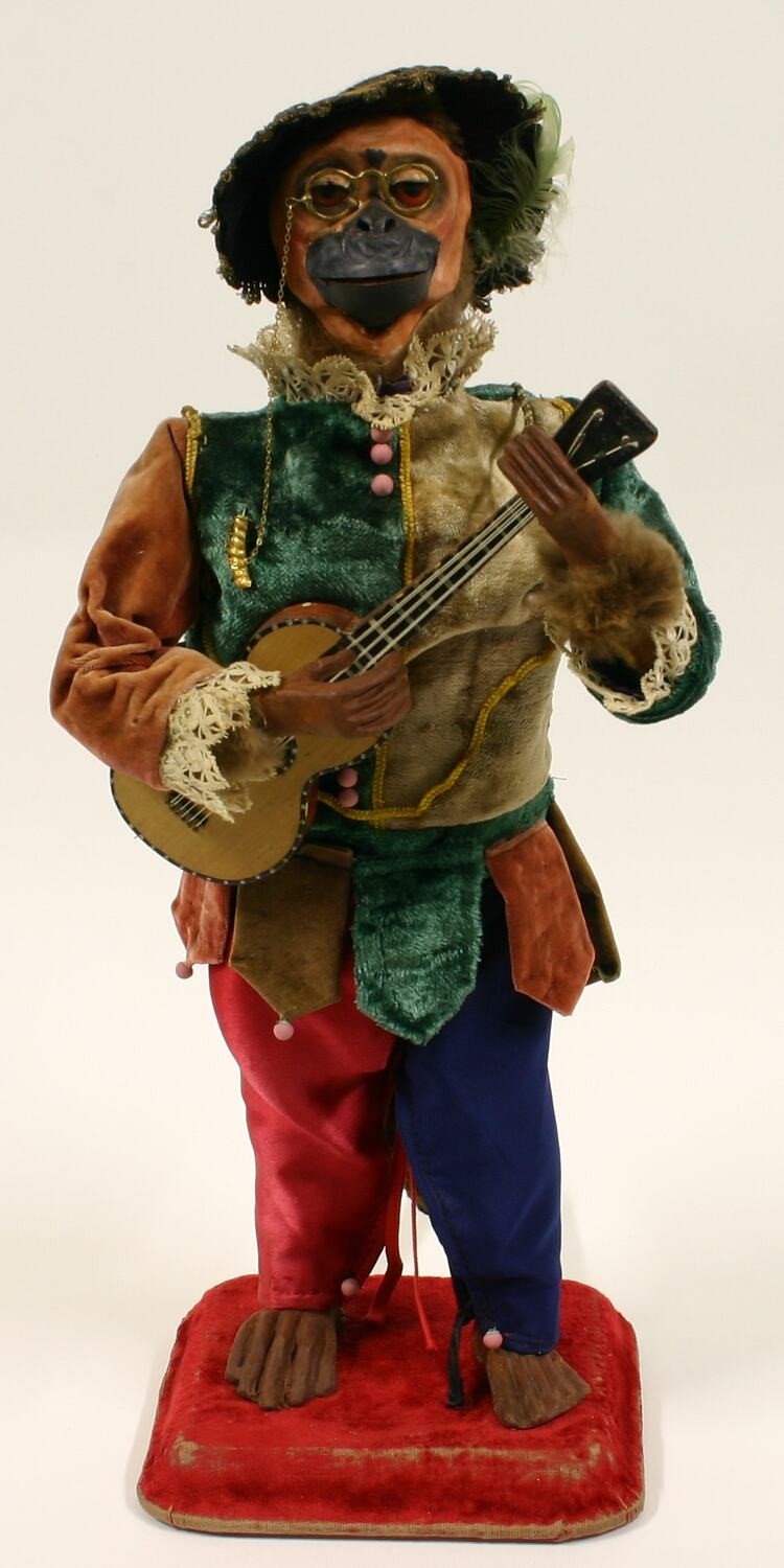Automaton Monkey (or chimpanzee) which contains a musical box that plays a tune. It is wound using a key near the base of the guitar, just above the key is a button to start and stop the music. While the music is playing the monkey moves its right arm up and down as though strumming the guitar. At the same time its head moves up and down and from side to side while the mouth and eyes open and close. The 19th century produced a wealth of mechanical dolls and toys known as automata. Many were made in small studios in Paris from 1848-1915 and brought to life both exotic and everyday events of the times.