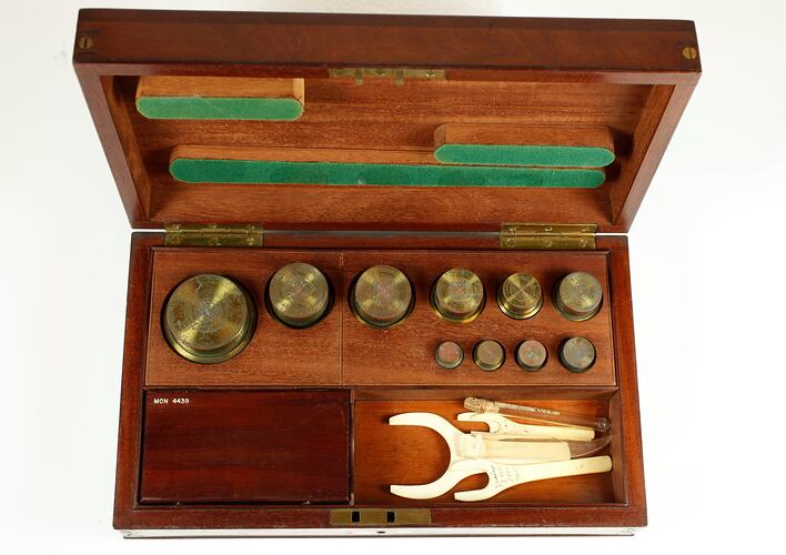 On lid, brass plate stamped: ' 619-2 / STANDARD WEIGHTS / ENGLISH / Troughton & Simms / London ' On lid, paper label, handwritten: ' 1 lb. No. 1373. 2800, 2100, 1400, / 700, 1000, 400, 300, 200, 100 grs. / in separate brass containers. / 40, 30, 20, 10, 4, 3, 2, 1, .4, .2, .1 / .04, .03, .02, .01 grs in wooden case / 5 lifters [obscured] forceps / Small we[absent]ts Pt', ' Brass / gilt ' Box and small box containing platinum wire weights both stamped 'MCN 4439'. On containers: ' Top / 1lb / 1373 ', ' Top / 2800 / Grains ', ' Top/ 2100 / Grains '. ' Top / 1400 / Grains ', ' Top / 700 / Grains ', ' Top / 1000 / Grains ', ' Top / 100 / Grains ', ' Top / 200 / Grains ' On glass tube, paper label, handwritten: ' Extra Weights grain .04 .03 .02 .01 / Troughton & Simms R.L.J.E ' On plastic forceps: ' A. J. FRANKLIN SYDNEY ' Each lifter has handwritten ink marks indicating for which weight it is used.