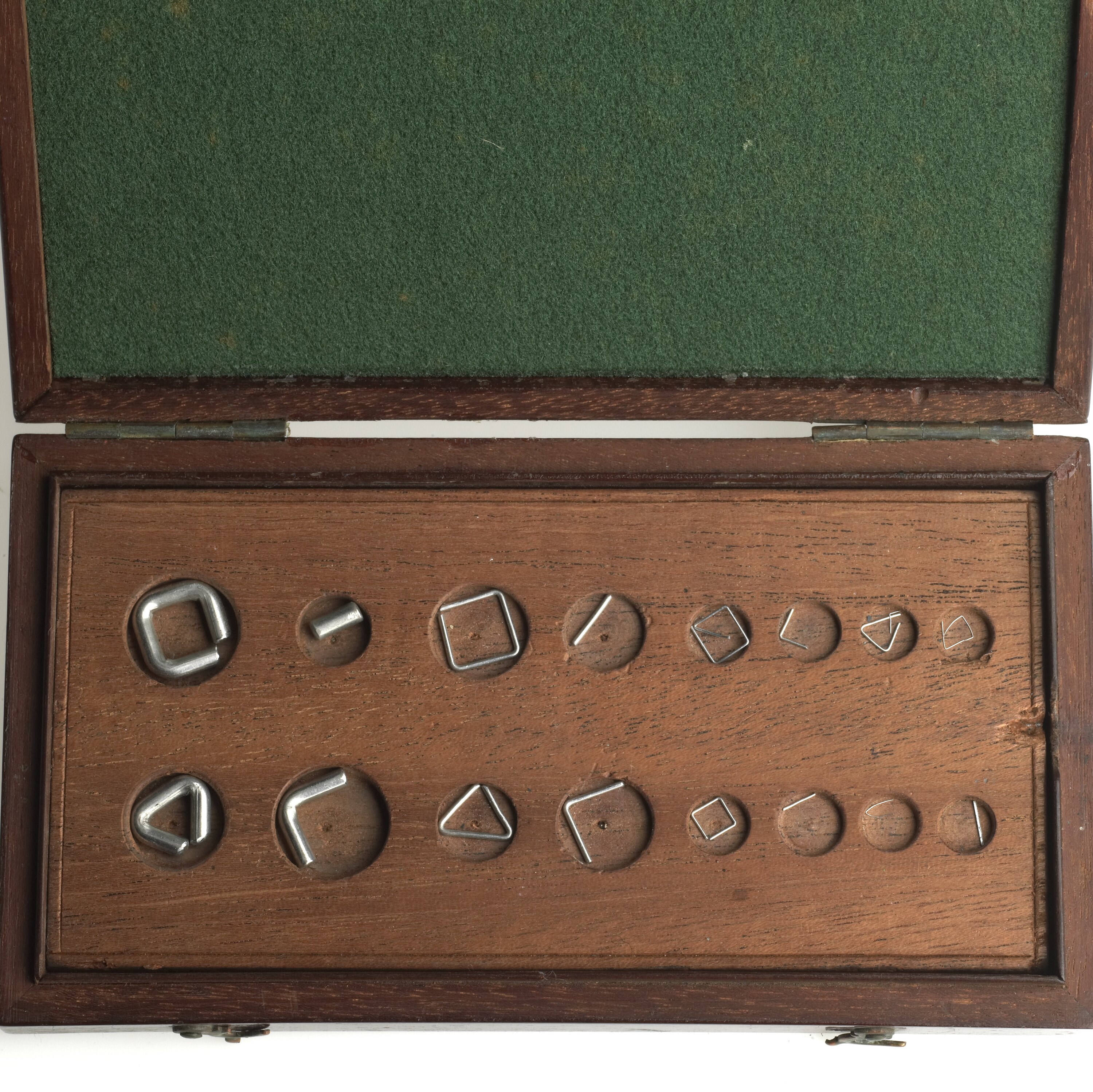 Gilt brass weights: 1 pound (no. 1373), 2800, 2100, 1400, 1000, 700, 400, 300, 200, 100 grains, each in brass cell. Platinum wire weights: 40, 30, 20, 10, 4, 3, 2, 1, 0.4, 0.3, 0.2, 0.1, 0.04, 0.03, 0.02, 0.01 grains. 4 ivory lifters and more recent plastic forceps. Extra platinum wire weights in glass tube: 0.04, 0.03, 0.02, 0.01 grains.