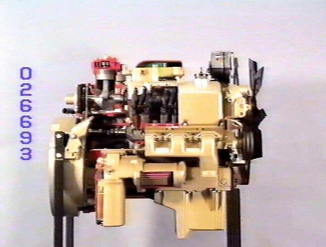 This 185 horsepower eight-cylinder diesel engine was made in Australia by Cummins Diesel Australia at their Maroondah Highway, Ringwood factory. It has been sectioned for display and was donated to the Museum by Cummins Diesel Australia in December 1970. This model engine was also sold as the V470-M for marine power use.