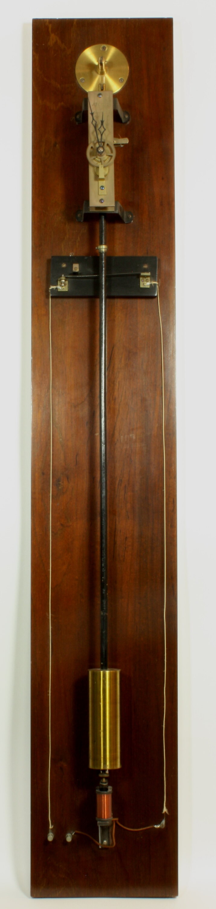 Clock mechanism is suspended on a polished backboard. Electric impulse movement.