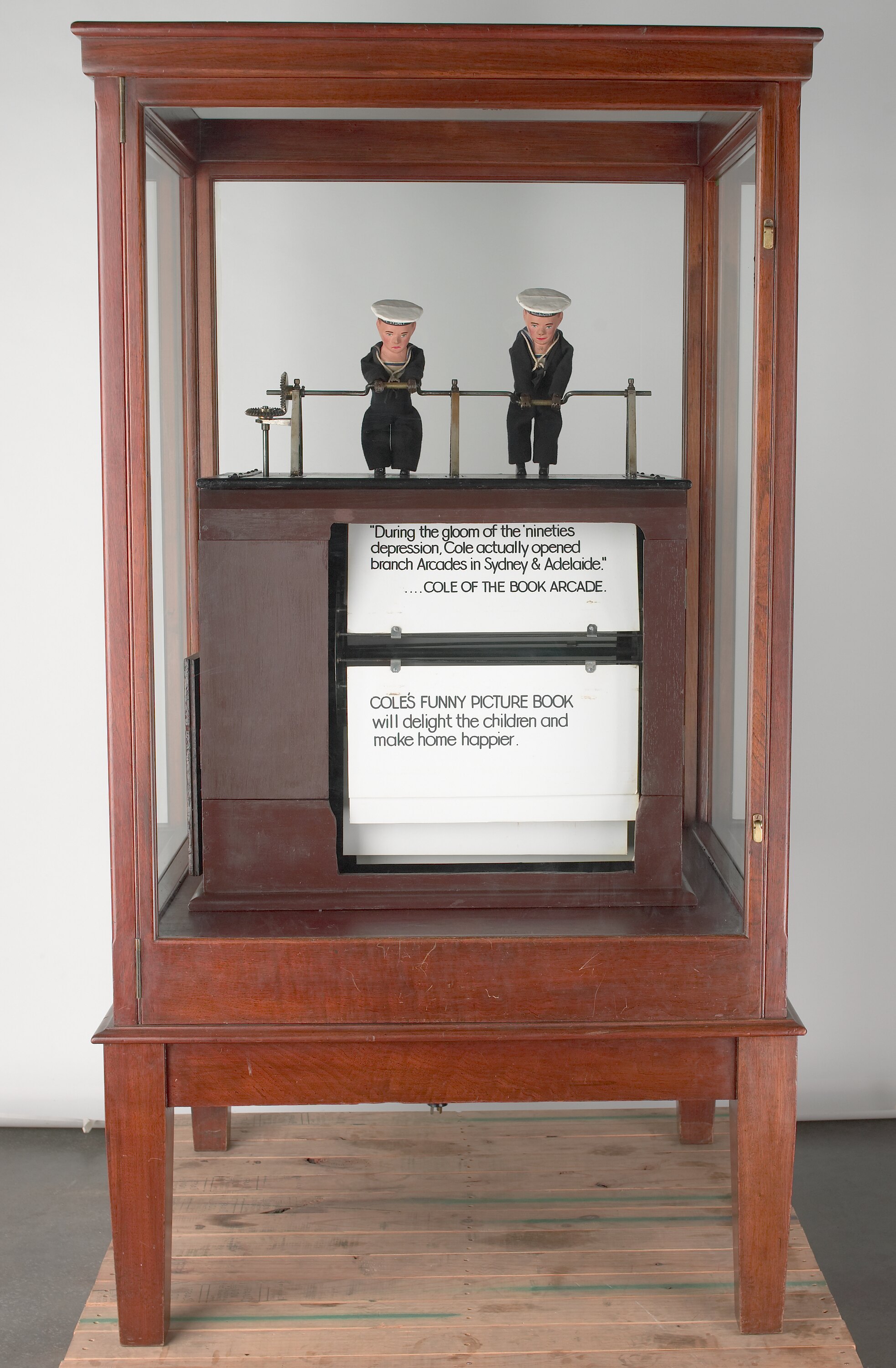 'Little Men' mechanical amusement or advertisement from Cole's Book Arcade. Depicts two 'sailors' operating revolving signs with a double-crank handle. The Little Men are dressed in sailor suits, and originally had dark-coloured caps. They may have been given their white caps bearing the names HMAS Sydney and HMAS Melbourne as a patriotic gesture during World War I - these ships were launched in 1913.