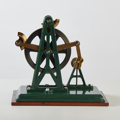 Metal model with green painted frame on varnished wooden base with metal circle in centre.