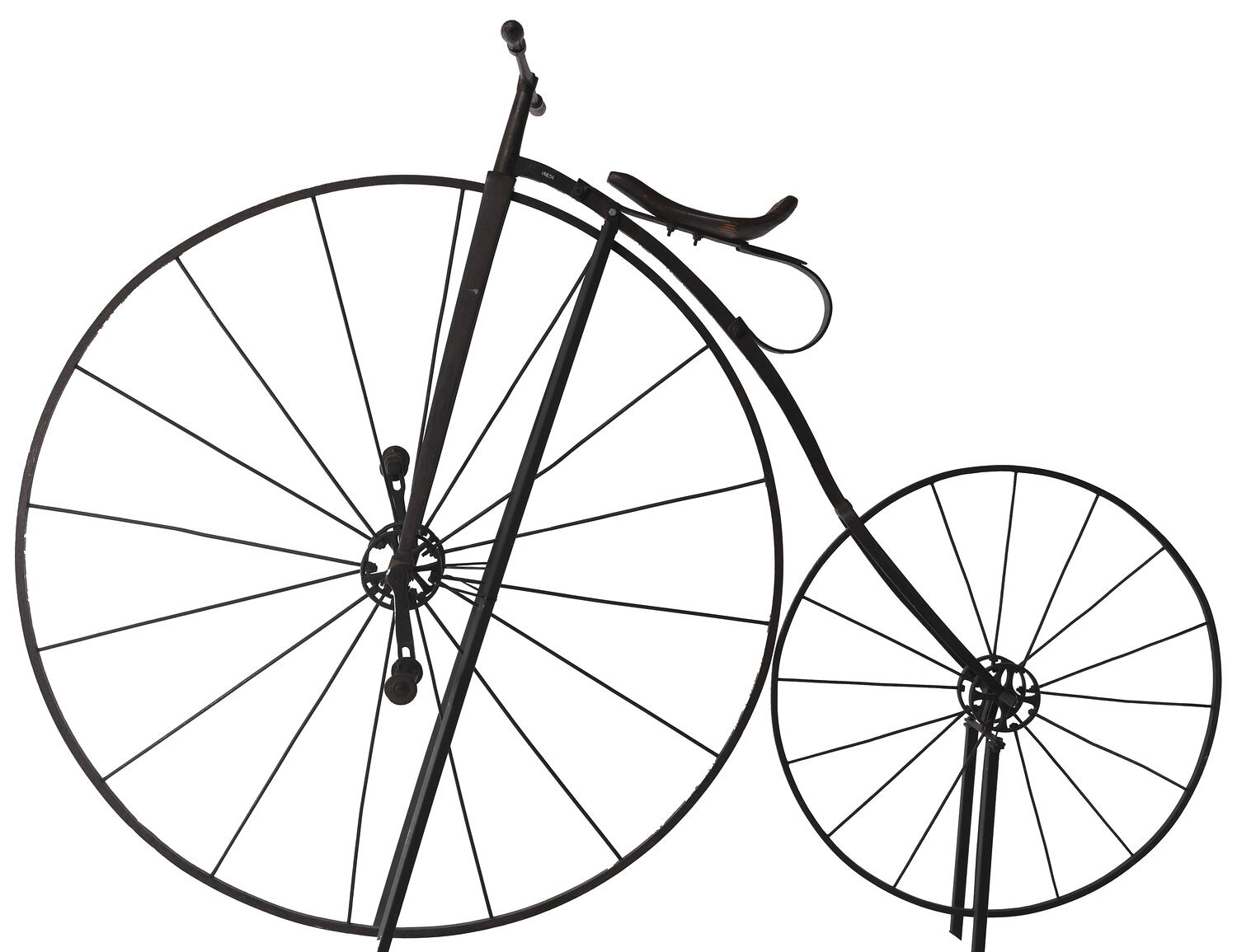 Bicycle made from iron painted black with large front wheel and small rear wheel. Both wheels have metal rims and no tyres. It has wooden handle bars and a wooden seat with a curved piece of metal for suspension.