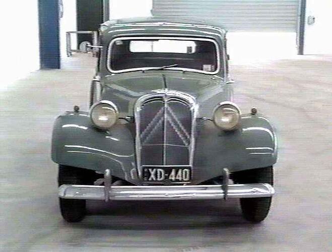 'Light 15' model front-wheel-drive four-cylinder petrol engined right-hand-drive five-seater all-steel saloon body motor car, built by Citroen Cars Ltd, Slough, Buckinghamshire, England, in 1951. Type 11CL8, Engine No.AF.15713, Chassis No.138177, equipped with 'Sunshine Roof' and painted 'Mint Green' with 'Fawn' leatherette upholstery & interior trim. The vehicle was shipped from Blakes Wharves at Fulham to Commonwealth Motors in Melbourne as one of about 687 Citroens of this model imported in 1951. It was sold by Shields Motor Company Pty Ltd, Flinders Street, Melbourne, to Mr Noel R. Huckell of Elsternwick, Victoria, on 31 January 1952, for £1,427. Noel Huckell was an electrical engineer employed by the Department of Civil Aviation. He was fastidious about maintaining his Citroen and kept a record of all service and replacement parts fitted from the date of first registration with the Victorian plates XD440. After over two decades faithful service as his family car, Mr Huckell sold the vehicle to the local Citroen agent A.O. Dutton & Sons Pty Ltd on 17 October 1974 and it was subsequently displayed in their showroom at Burnley. The Museum purchased the vehicle from Duttons in March 1983. It has 56,000 miles recorded on the odometer and includes the original tool kit and registration papers. The original registration plates and engine are still fitted.