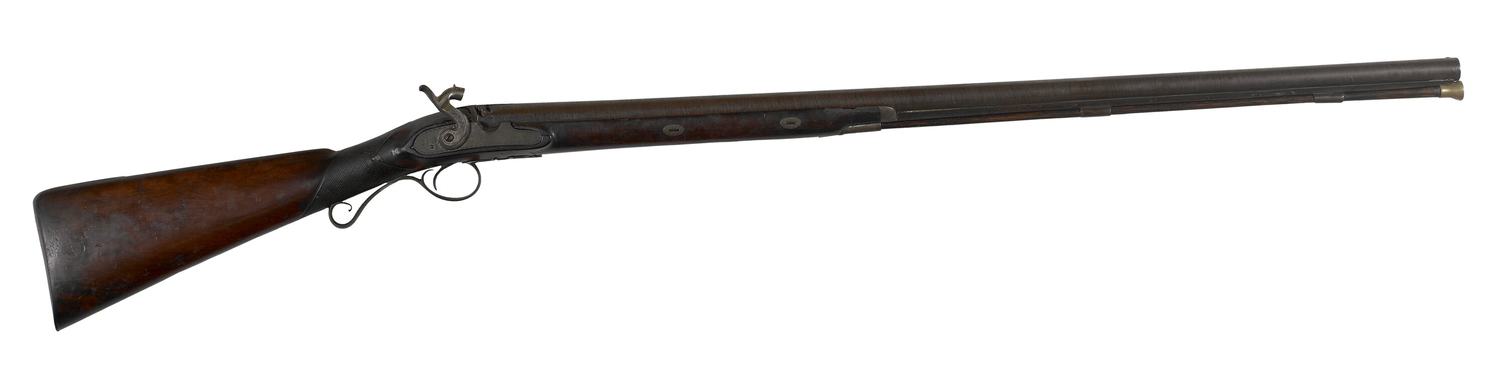 Lower rib and three ramrod tubes attached, two gold bands at breech, recessed gold inlaid Parker monogram on barrel top at breech '(crown)/ W. PARKER/ HOLBORN/ LONDON' with engraved star burst motif, barrel fasten to stock through two barrel keys, brass tipped wooden ramrod. Hammer engraved with simplistic foliate scroll, nipple damaged walnut straight half stock with nickel silver forend cap, chequered at wrist, cheek piece on L.H. side, vacant silver escutcheon on wrist upper, steel triggerguard with forward pineapple finial and rear hand hold.