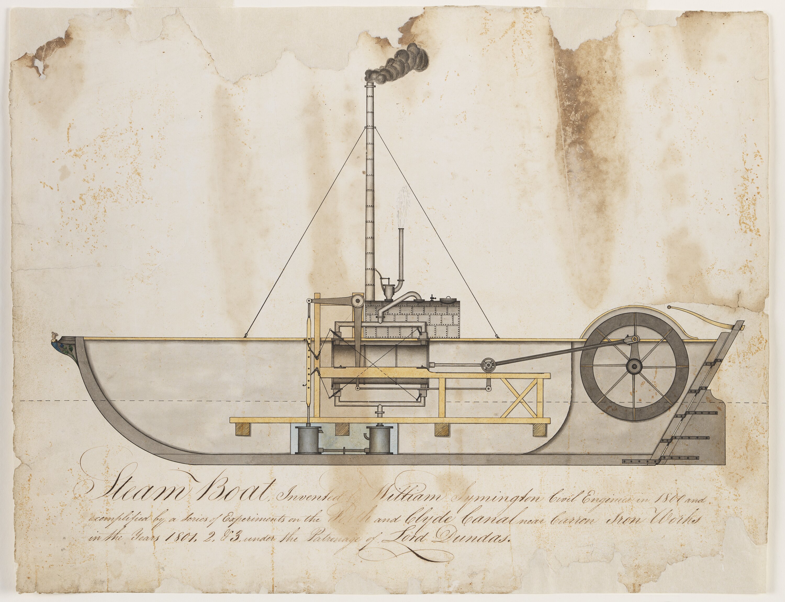 Watermark: 'J Whatman', 'Turkey Mill', '182[8?]' Handwritten, ink: 'Steam Boat Invented by William Symington Civil Engineer in 1800 and / exemplified by a Series of Experiments on the Forth and Clyde Canal near Carron Iron Works / in the Years 1801, 2, & 3 under the Patronage of Lord Dundas.'