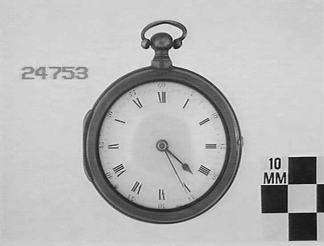 Silver pair case, but outer one appears to be a replacement. Dial has roman numerals for hours and arabic numerals for minutes. Gold hands. Key wound spring; verge escapement.
