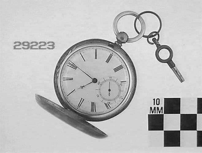 White enamel dial has roman numerals and seconds dial at 6. Key wound spring; lever escapement. Fusee and chain.