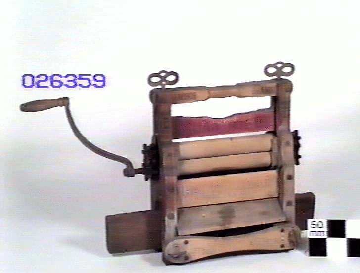Small upright device with two rollers. Uses spring and cog mechanism for applying pressure to the rollers. Has handle on its right hand side for turning the rollers.