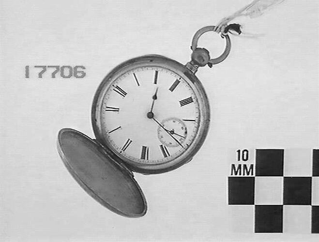 Silver hunter case with engined pattern and marking 'M.M.' on front and back. White enamel dial has black roman numerals and seconds dial at 6. Key wound spring; lever escapement.