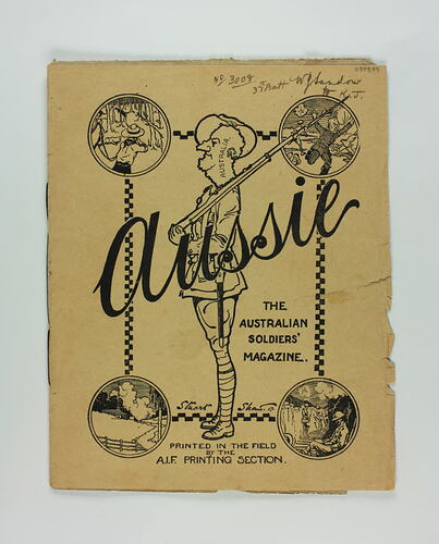 This object provides an Australian soldiers' view of the political and world climate during World War I, and also represents the bond between Australian soldiers. The magazine celebrated a distinctive 'Aussie' identity, through language, humour and their assertion of what it meant to be an Australian. It allowed news to be distributed, gave the soldiers an outlet to express any dissent or dissatisfaction, thus preventing any greater form of rebellion and promoted Australian authors like Banjo Paterson, C.J. Dennis and Bernard O'Dowd. After the war, Phillip Harris produced a monthly in Sydney from 1920 and renamed it: 'Aussie: the Cheerful Monthly'. It built a sizeable circulation and for more than a decade it published the major Australian writers and cartoonists of the day. It set out to sustain the digger culture and defend the rights of the veterans, while also embracing the re-adjustment of returned soldiers into civilian life.