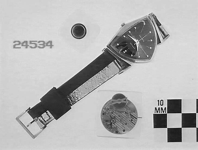 Gents electric watch, triangular case, Hamilton Watch Co, Lancaster, Pennsylvania, USA, 1956. One of a small number of pilot lots produced by the company prior to its commercial release in 1957. The company donated samples from the pilot lots to museums in 1958.