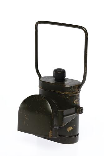 Military issue 'dark lamp' and electric battery made by Kempthorne Australia in 1944. Painted khaki green. Metal cover which can be lowered over the light for use in black-out conditions. The lamp would give a glimmer of light, nearly enough to see the road by, but the light could not be seen from above.