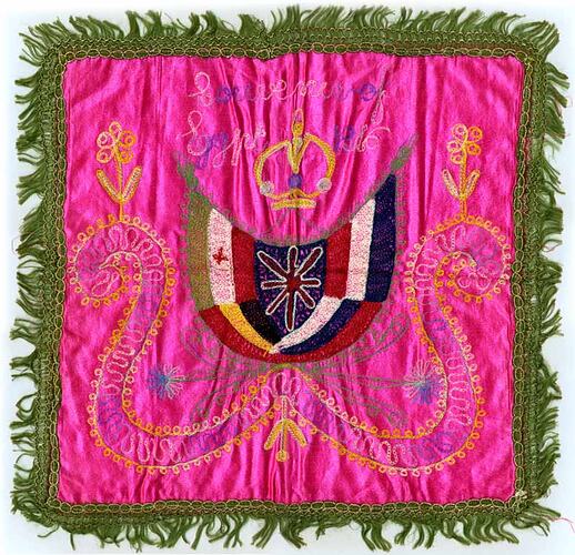 Embroidered silk panel with fringe, bought by Sapper Alfred Galbraith as a souvenir of his time in Egypt. It features flags of the United Kingdom, Hungary, Germany, Russia, and the Netherlands.