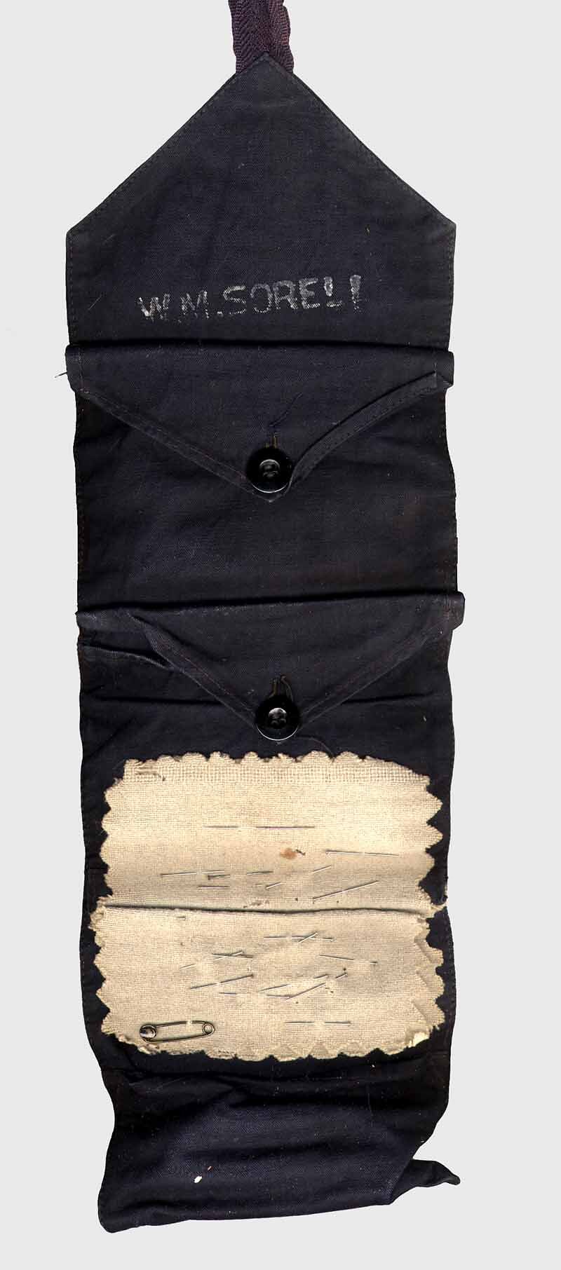 Sewing kit, known as a 'housewife' ('hussiff') issued to William Sorell during World War I. The kit contains thread, a tailor's thimble, needles, pins and a waxy compound in small compartments.