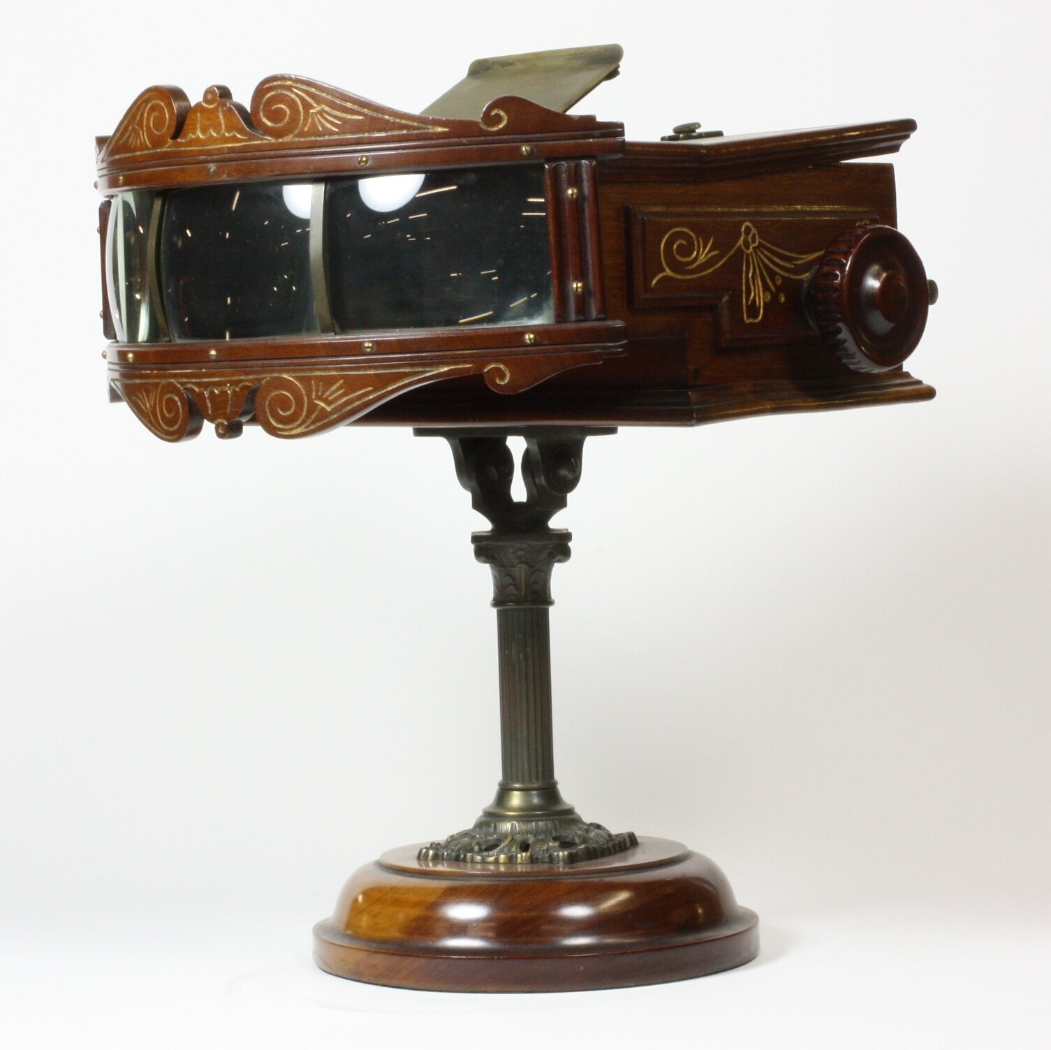 Wooden body on stand. Body comprises lens for light source at front, cavity inside in which image reel is housed, and a handle on the side for turning the reel. The body is mounted on a metal column, with pivot points on top; column is mounted on circular wood base. Reel is secured at centre with circular brass plate, with inscription.