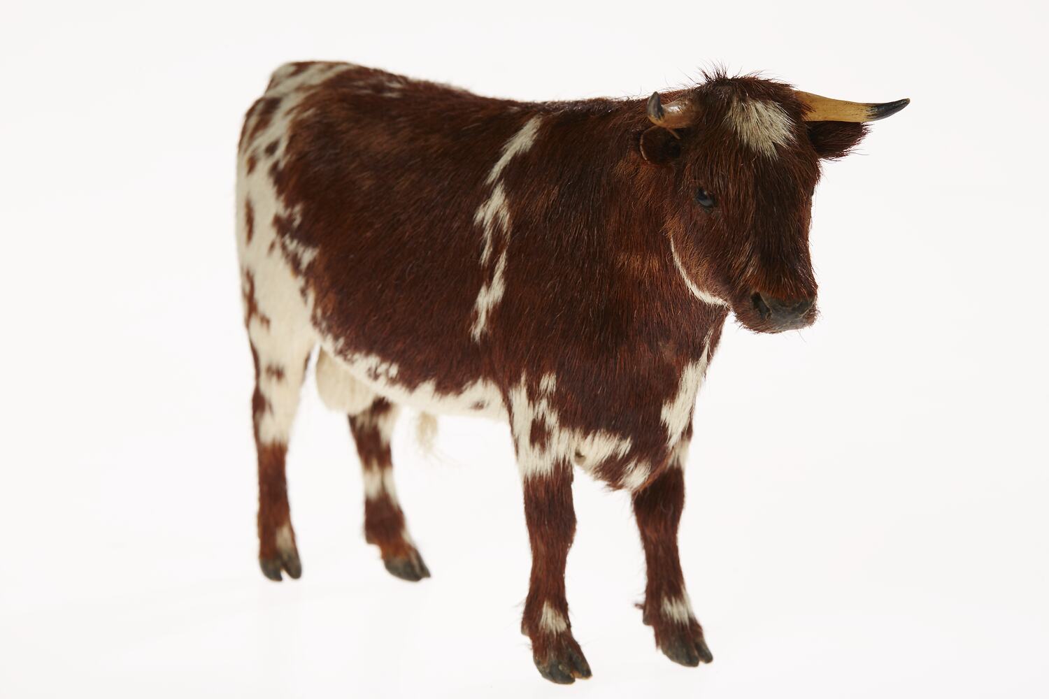 Model of standing bull, brown and white, with horns. The model consists of a paper mache armature, shaped with beeswax, and brown and white coat consisting of cow hair. The eyes are probably made of glass, with ears & hooves of wood. Horns are made from real horn whittled down to size. Scale approx. 1:12.