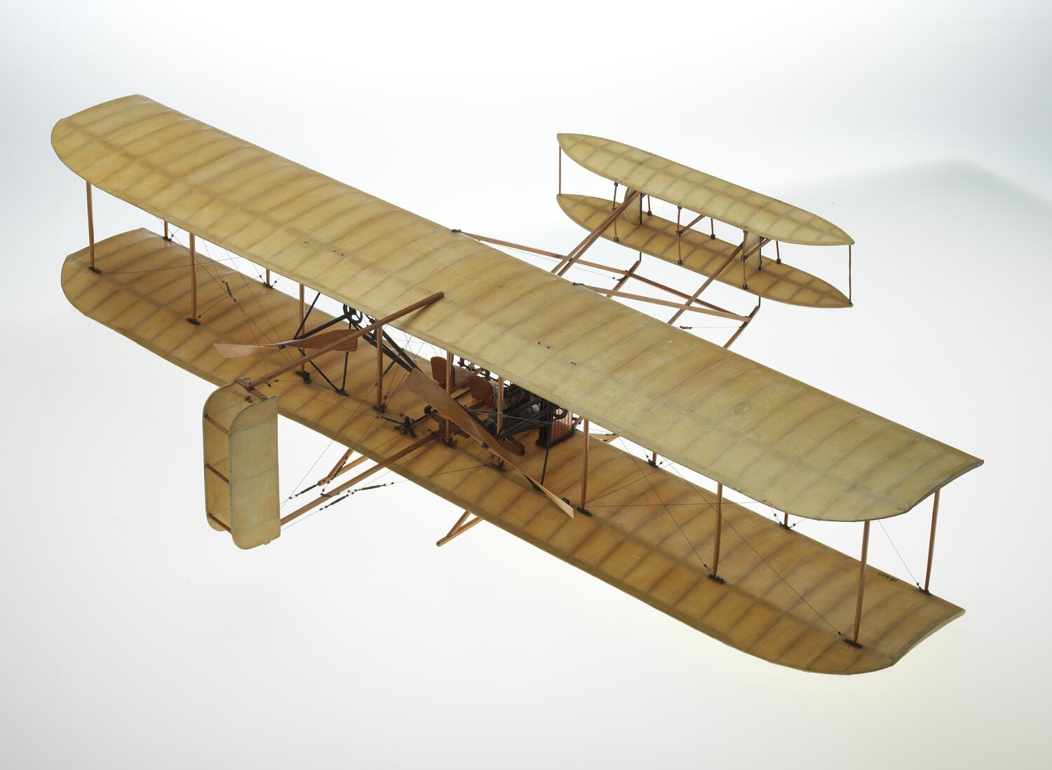 Scale model of the Wright brothers Model 'A' biplane, commissioned by the Industrial & Technological Museum (predecessor to Museums Victoria) and built by Harold P. Wood in 1924-25.