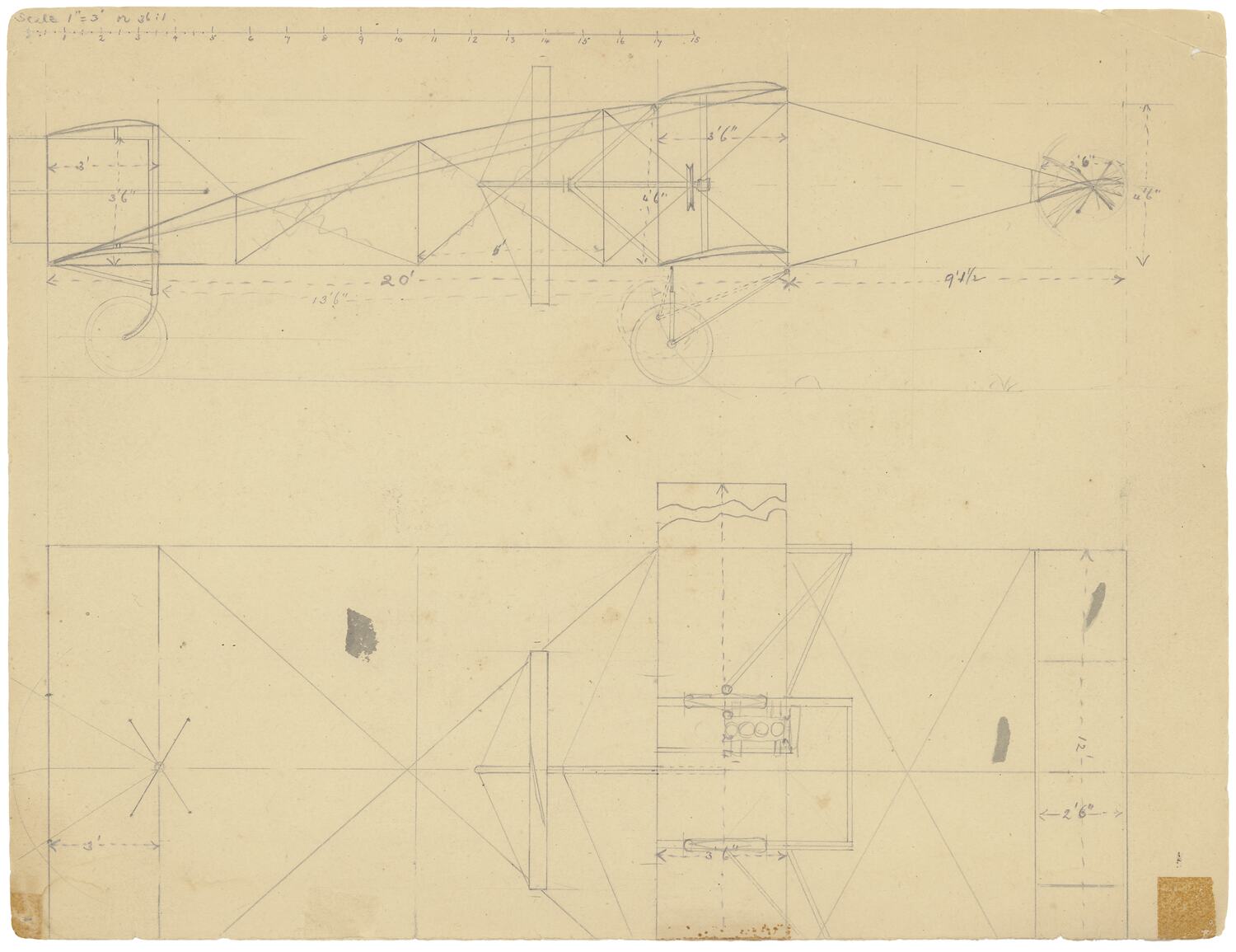 The drawing shows a side elevation of the aircraft in its final form as it had evolved by October 1910 at the top and a plan view of the aircraft below in slightly earlier form including the fixed foreplane between the main wings and front elevator, both drawn to a scale of 1 inch = 3 feet (1:36).