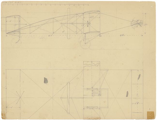 Plan for biplane design drawn by John R. Duigan in preparation to construct the aircrraft which he first flew on the family property 'Spring Plains' at Mia Mia, near Heathcote, central Victoria, in July 1910.