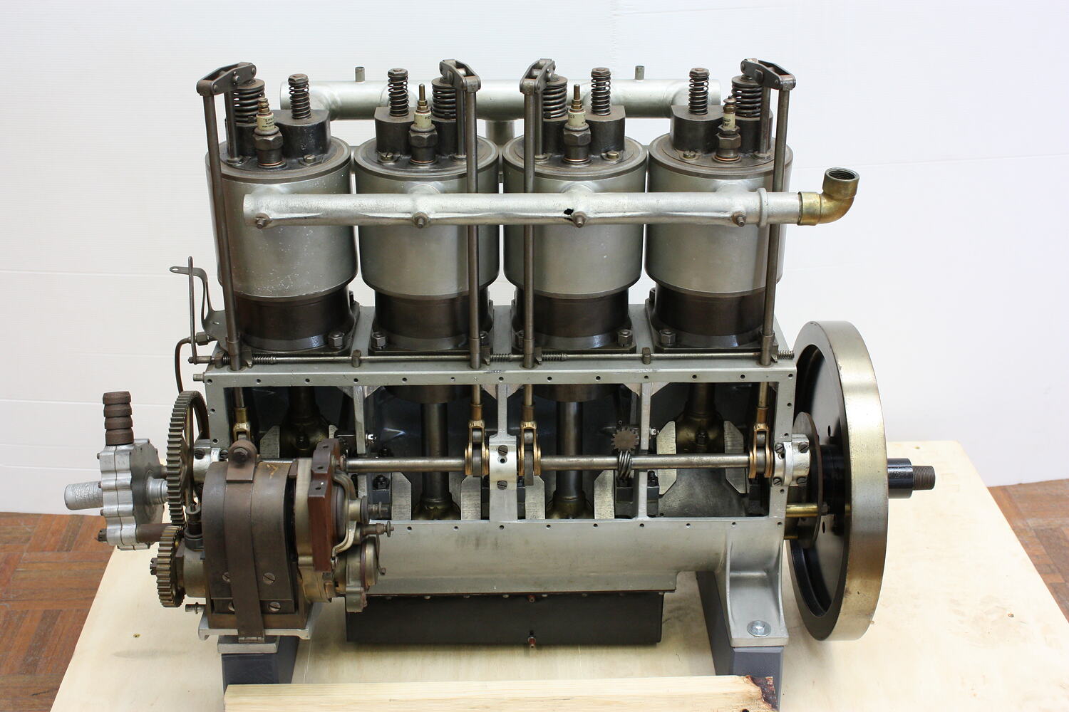 This four-cylinder vertical water-cooled aero engine was designed by Orville Wright in about 1906 and built under licence by the engineering firm Bariquand et Marré in Paris in about 1908-09. It carries the manufacturer's serial no.14. Bariquand & Marre modified the valve and cam design from the Wright original which did not please Wilbur Wright who supervised the preparation of the engine for production in France. He wrote in his diary on 9 June 1908 that "We went to Bariquand's but of course nothing was ready. I fear they will have the old motor ruined before I can get it out of their hands. They are such idiots! and fool with things that should be left alone". The Wright engine was also licence-built in Germany by Neue Automobil-Gesellschaft and by the Wright Brothers own company in the United States of America.