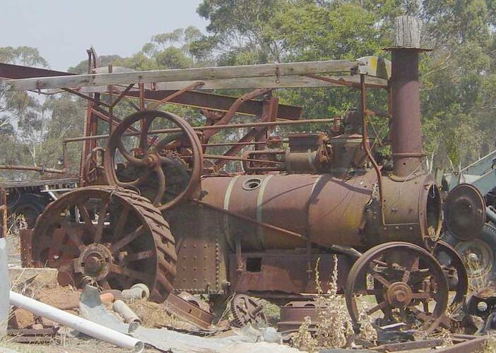 Steam traction engines were one of the most complex and sophisticated pieces of machinery employed in rural Australia during the late 19th and early 20th centuries. From around 1880 until the Second World War they provided a key form of motive power in agriculture, mining, sawmilling and other related industries, as well as being widely used for land clearing and road transport. One of the most distinctive and successful roles played by traction engines was in providing a convenient mobile power source for threshing and chaff-cutting contractors, who were able to employ the engines both for driving their machinery and for hauling their equipment when travelling on the road between farms. During the summer months, dozens of engines could be seen on the country roads of rural Australia, trundling along with a caravan-like procession in tow, including the threshing or chaff-cutting machine, hay elevator, living van and ubiquitous water cart. Teams of itinerant workers moved with the engines from farm to farm, living on the road and maintaining a tough but unique way of live.