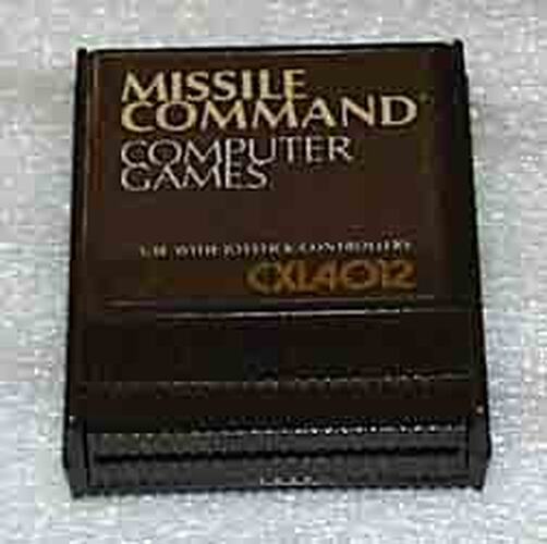 Atari computer cartridge for use with the Atari 800 system. Cartridge contains 'Missile Command' game.