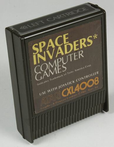 On front: SPACE INVADERS* / COMPUTER GAMES / *Indicates Trademark of Taito America Corp. / USE WITH JOYSTICK CONTROLLER / ATARI CXL4008 / Graphics & Program Contents C1981 Atari Inc. On back: ATARI / PROGRAM C 1979, ATARI INC. / A Warner Communications Company On top: LEFT CARTRIDGE